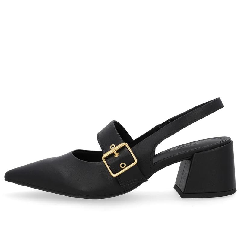 Slingback salto bloco com cabedal em couro napa valise na cor preto. O modelo possui tecnologia Calce Fácil, com modelagem inteligente em adaptar o calçado a ergonomia dos pés.