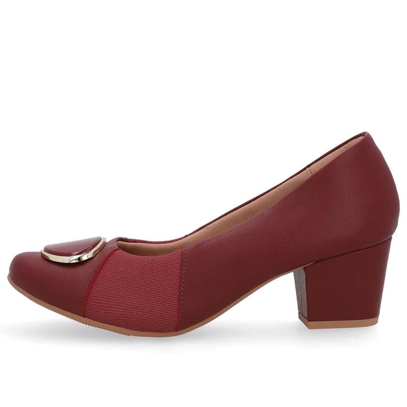 Scarpin cabedal em couro e tecido na cor rebu. O modelo possui tecnologia Joanetes, que alivia o desconforto da região, garantindo s uavidade na pisada por usufruir de materiais moldáveis nos pés.